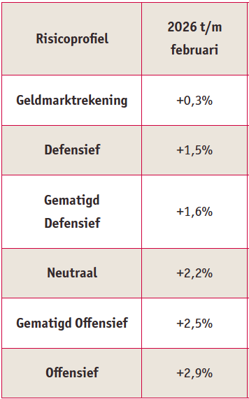 Februari was een positieve maand voor onze portefeuilles. Ondanks geopolitieke spanningen en economische onzekerheden wisten aandelenmarkten wereldwijd hoger te eindigen. Dat zien we ook terug in de portefeuilles: alle risicoprofielen behaalden een positief rendement.