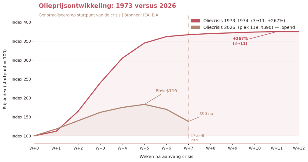 In 1973 kon een Arabisch olie-embargo de wereldeconomie in één klap op de knieën dwingen, met een verviervoudiging van de olieprijs, dubbelcijferige inflatie en een wereldwijde groeival van bijna 7 naar 2 procent. In 2026 waarschuwen het Internationaal Energieagentschap (IEA) en marktanalisten opnieuw voor een van de grootste olieschokken sinds de jaren zeventig, dit keer door een directe militaire confrontatie tussen de VS, Israël en Iran en zware verstoringen van de scheepvaart door de Straat van Hormuz. De centrale these in dit artikel is Hoe de oliecrisis van 2026 milder uitpakt dan die van 1973, omdat olie nu een veel minder dominante plek in onze economie inneemt en hernieuwbare bronnen en efficiëntie onze kwetsbaarheid aanzienlijk hebben verlaagd. Tegelijkertijd laten recente ontwikkelingen zien dat de situatie volatieler is dan aanvankelijk gehoopt.